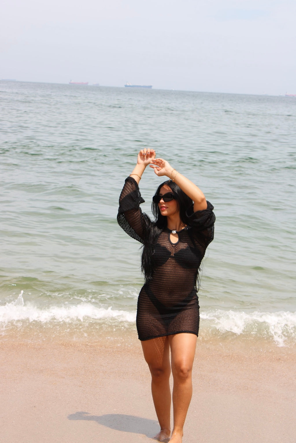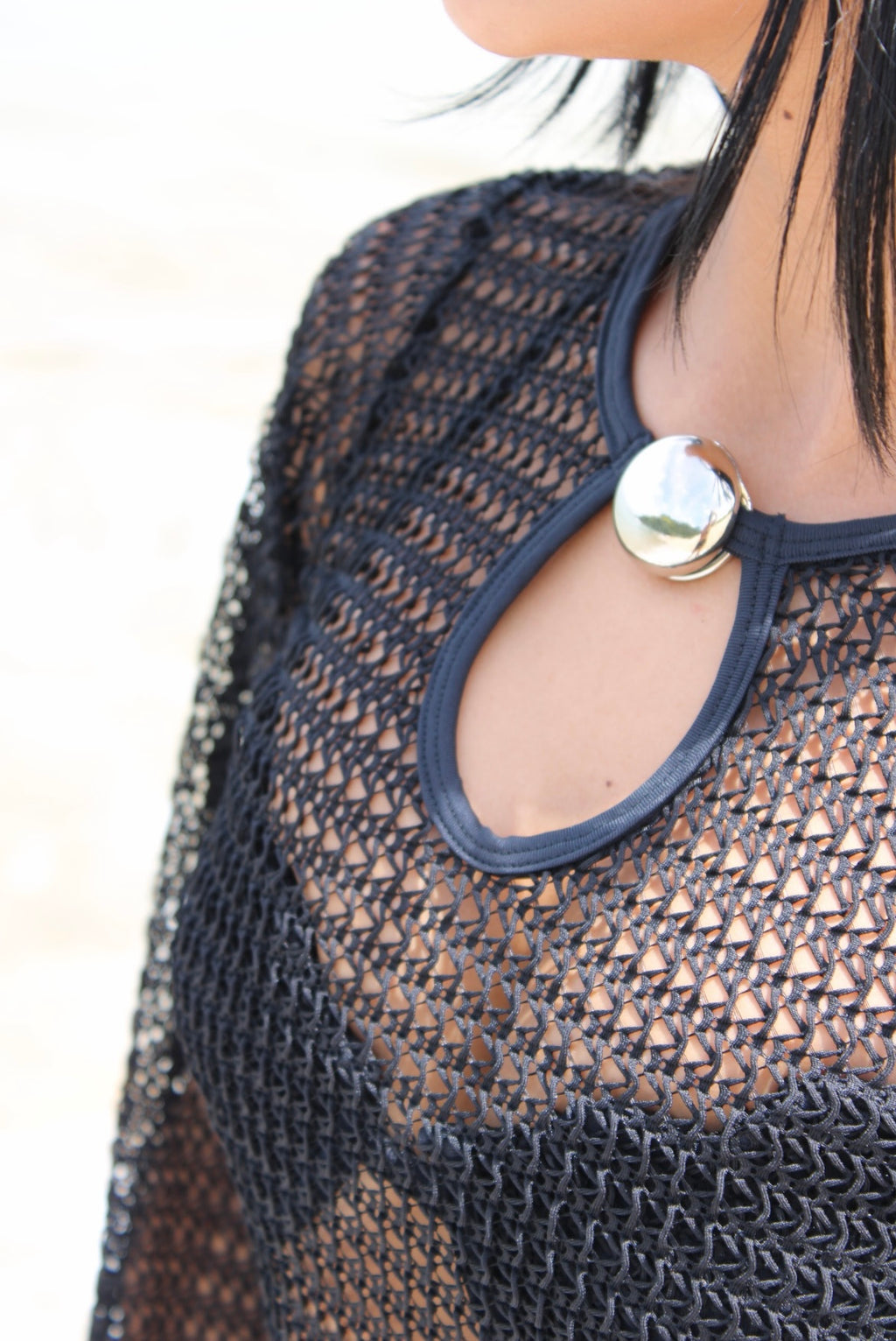 Saída vestido curto com manga sino, recorte com detalhe prata em material que não oxida