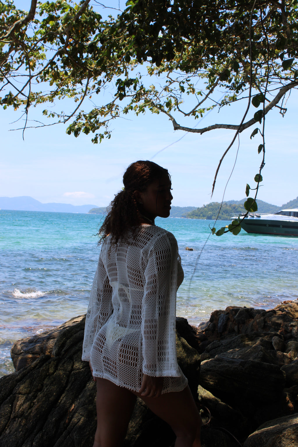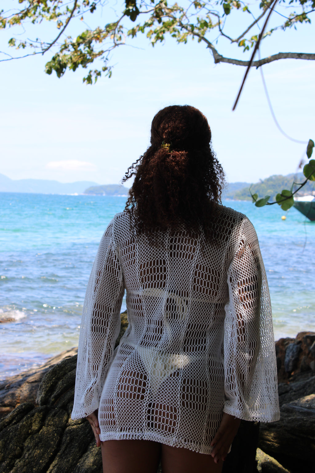 Vestido de praia curto, mangas estilo sino, recorte em U nos seios
